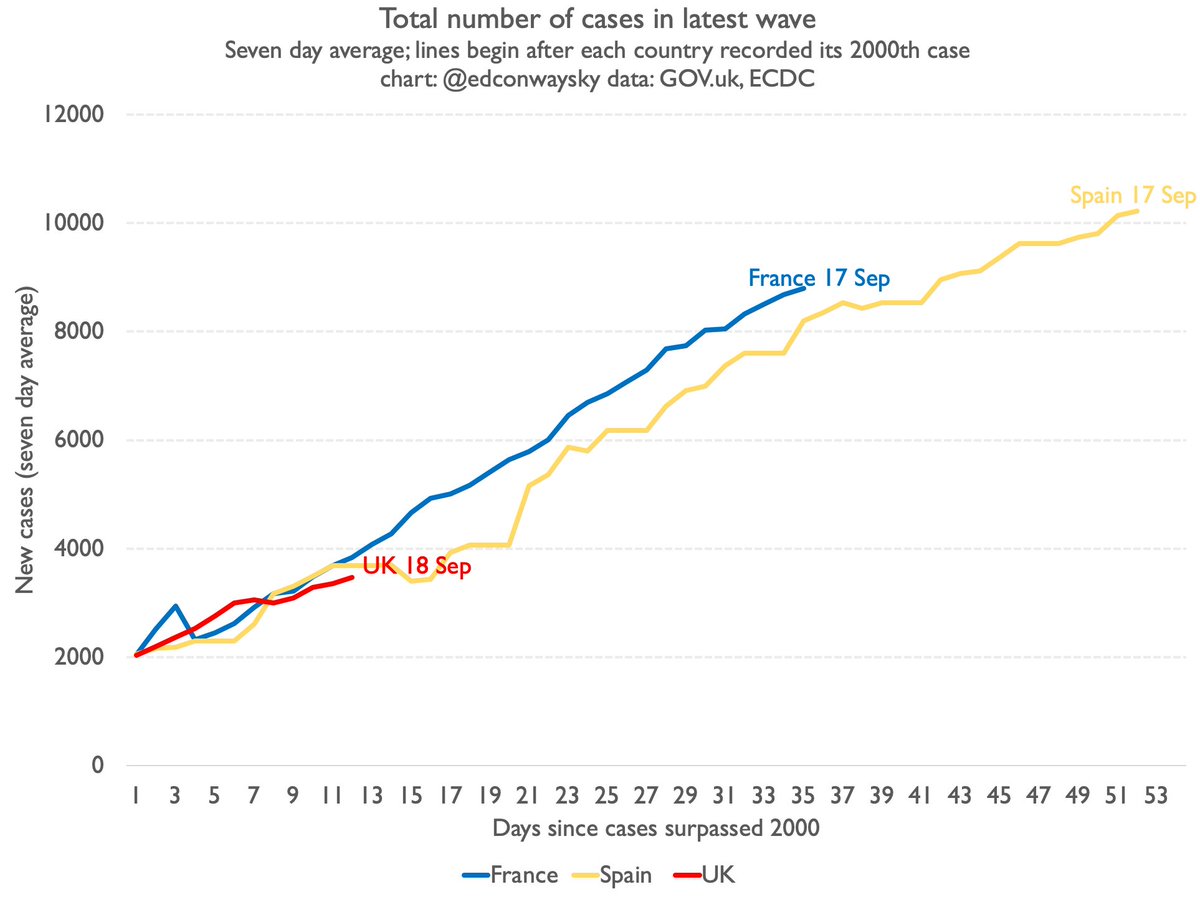 I've been making three points: 1. yes cases are rising, but so far nowhere as fast as in spring. 2. UK following v much in Spain & France's footsteps - so we get a sneak preview of where we're heading 3. News from France/Spain backs up point 1: #COVID not taking off like Spring