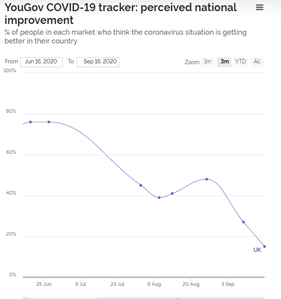 70% think Covid is getting worse, up from 54% last week. Hopes that the situation was improving have collapsed over last 4 weeks - from 48% to 14% since late Aug. (YouGov)