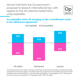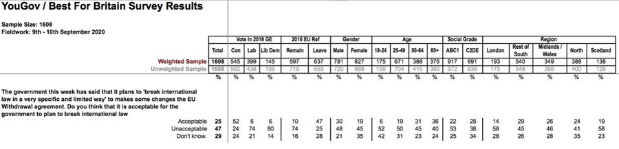 A plurality opposed the government’s position on breaching international law: polls varied between 25-49 (-24) and 33-46 (-13) with a large number of Don’t Knows.