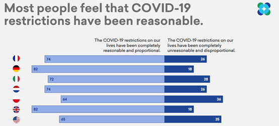 Here is some bad news for @toadmeister and the Lockdown Sceptics; they seem especially un-influential in Britain, where people (8/10) are most likely to think the restrictions have been completely reasonable and proportional