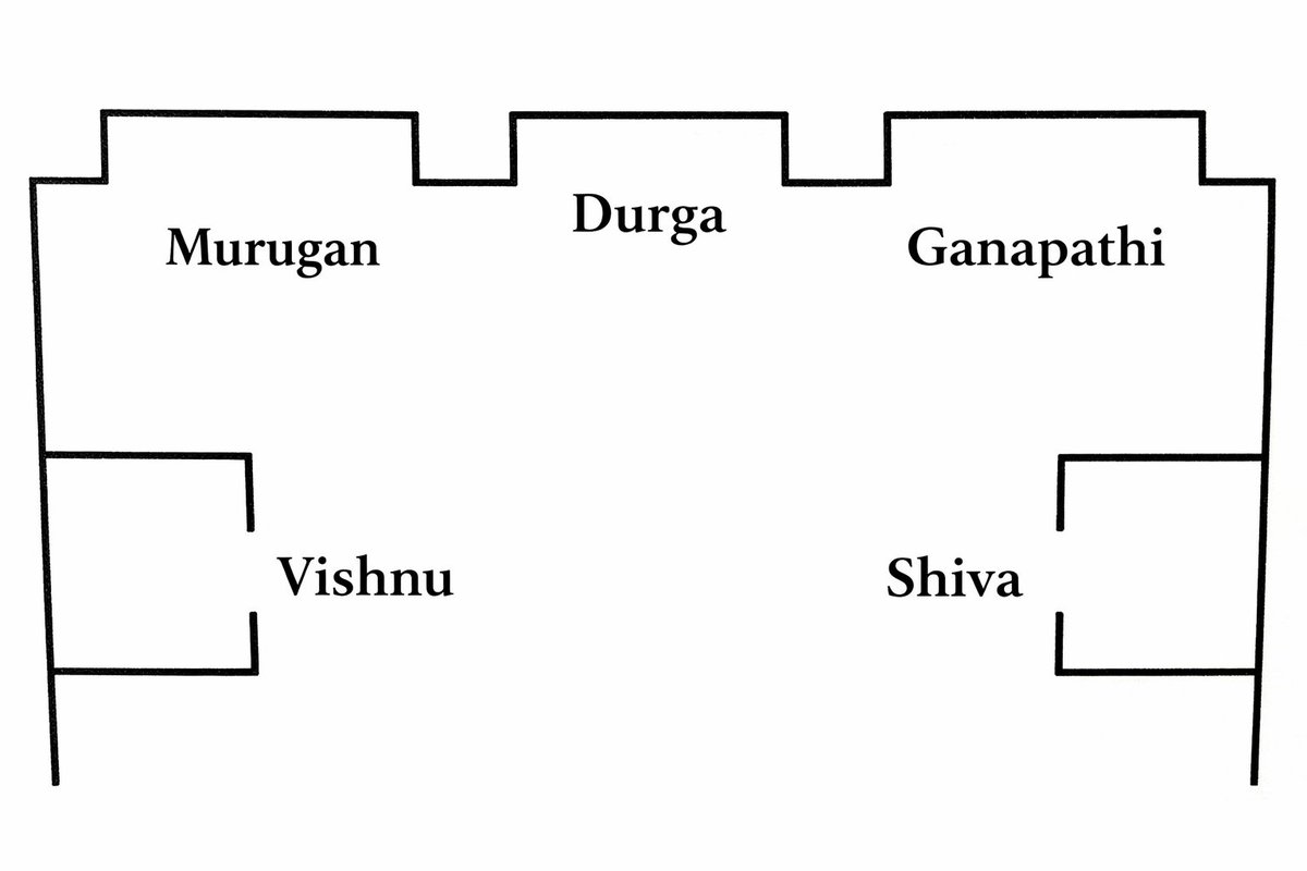The sanctum of the temple is unique with five shrines. The east facing shrine on the right is of Siva and the shrine of Vishu is on the left side. There are three panels on the backwall.
