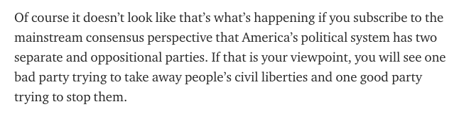If you understand that the US has a two-headed one-party system, what you see is a single entity threatening to take away your civil liberties if you don’t support it. A single establishment threatening to punch you with its right hand if you don’t let it punch you with its left.