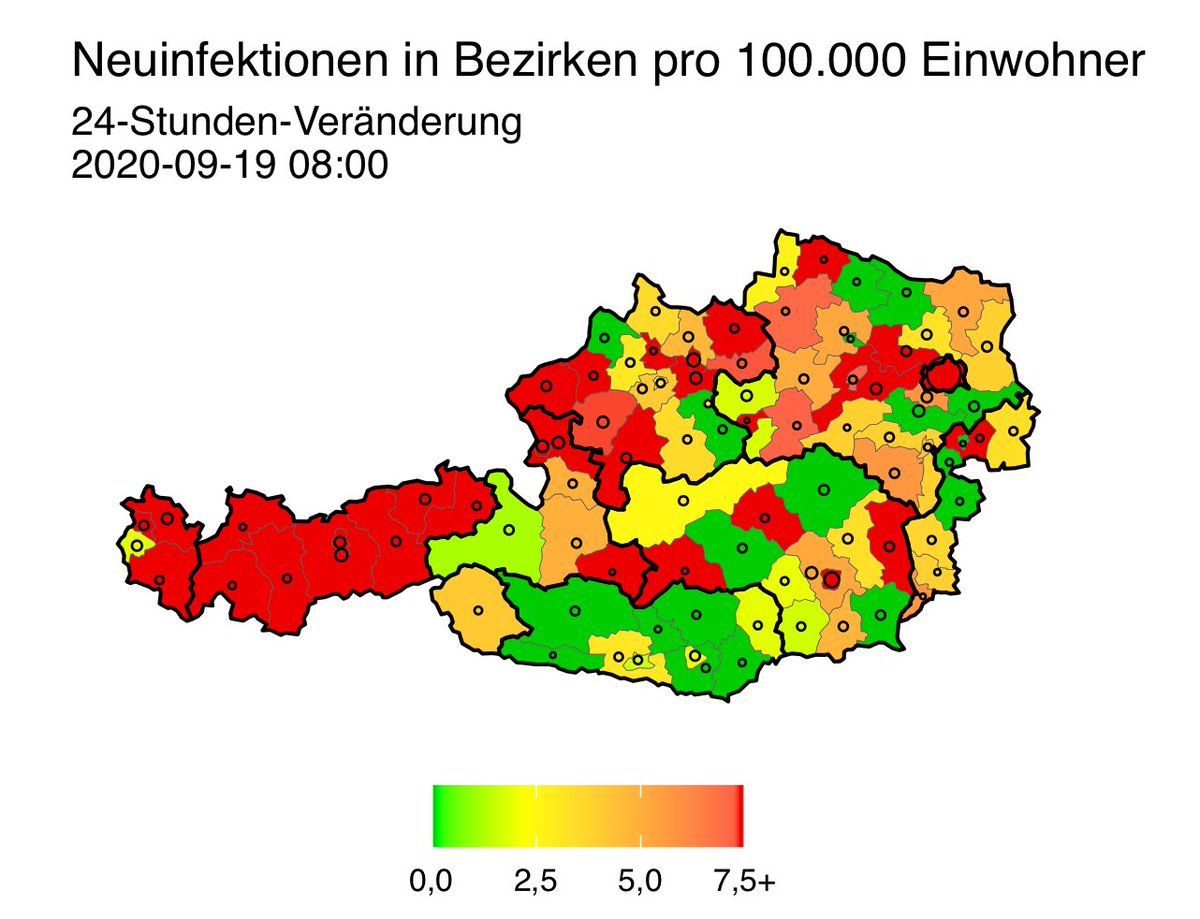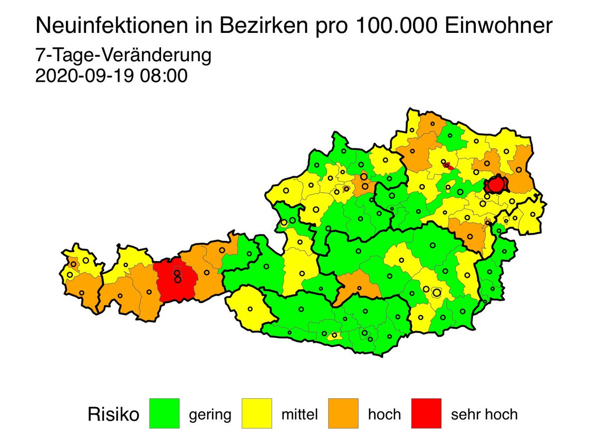 Danach sind Wien, Krems, Innsbruck und Innsbruck-Land bei >100 neuregistrierte Fällen in 7 Tagen.