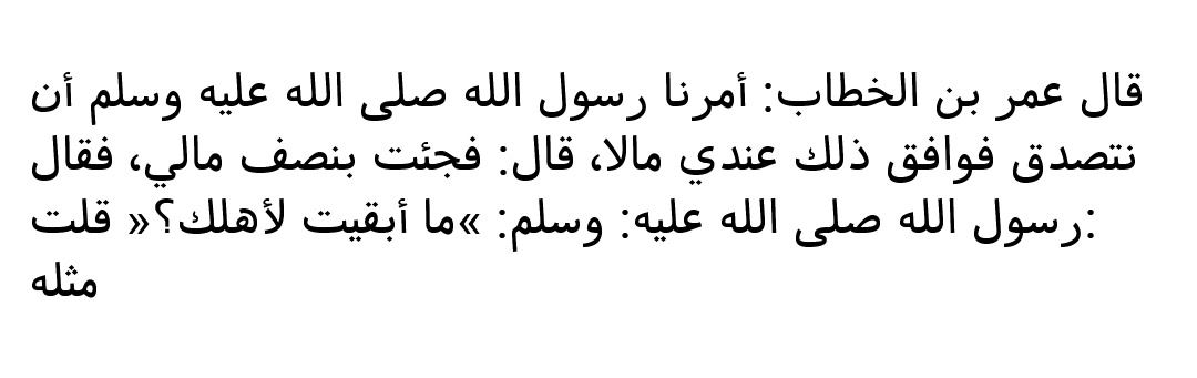 Umar berkata bahwa Rasulullah Saw memerintahkan kami bersedekah, kebetulan saya punya harta. Saya bawa kepada Nabi separo harta saya.