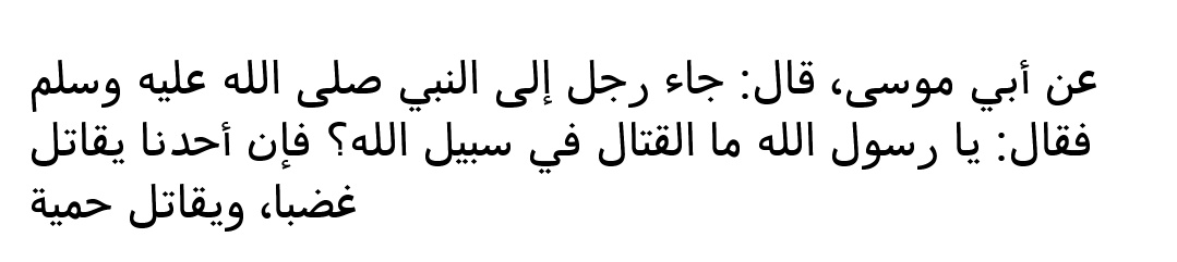 Abu Musa berkata bahwa ada seseorang datang kepada Nabi Saw dan bertanya: "Wahai Rasullullah, apa perang di jalan Allah? Sebab ada di antara kami yang berperang karena marah dan ingin melindungi keluarga."