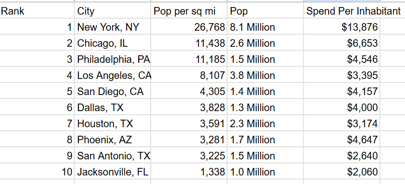 Looking at the extreme example, NYC's municipal social spending alone is the same as San Antonio's entire spend.