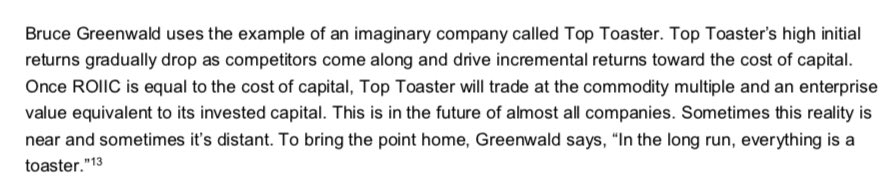 3/ "competitive forces will drive returns down to the cost of capital over time. If a company earns above market required returns, it will attract competitors that will accept lower returns, eventually driving industry returns lower." Michael Mauboussin people.stern.nyu.edu/adamodar/pdfil…
