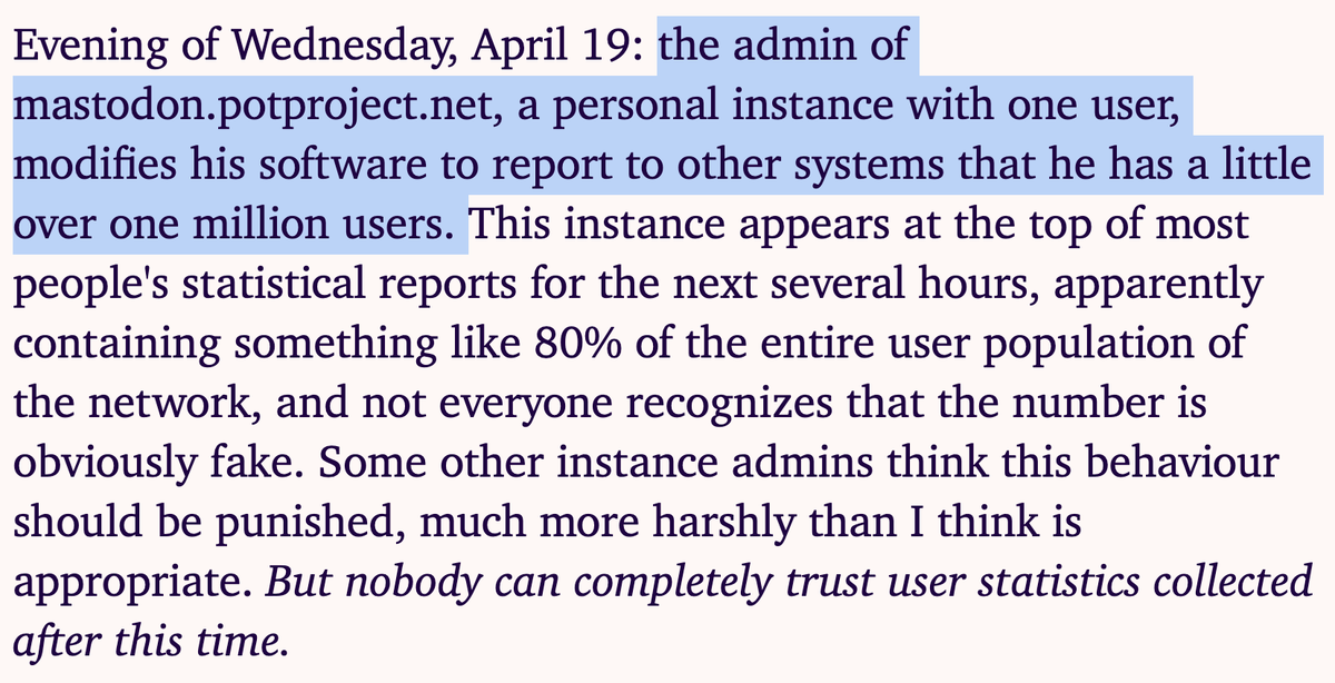 With pure P2P, problems like discovery, indexing, or contentious global state (eg leaderboards) become difficult. There are workarounds like magnet links. But also failures like this: ansuz.sooke.bc.ca/entry/335