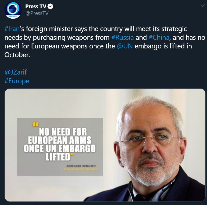 Press TV is citing @JZarif saying #Iran will insist on purchasing arms from Russia & China.