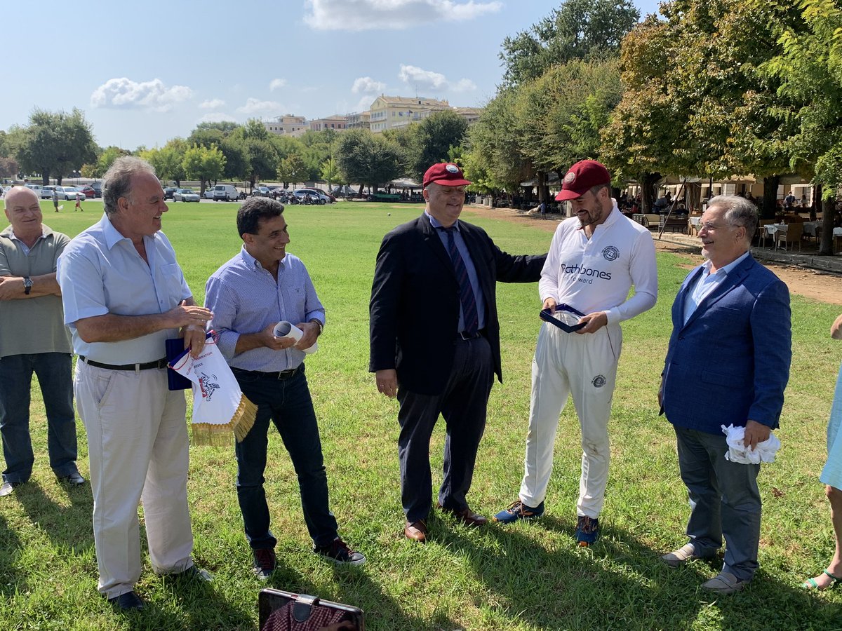 We crawl our way to 118 all out. During the innings break, the deputy mayor welcomes us to Corfu, & salutes the 197 years of cricket played on this beautiful & historic ground. Their welcome - & the incredible generosity of @CorfuArts - will be an indelible memory of 2020.