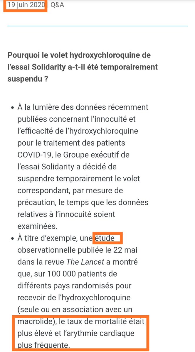 2 semaine après le retrait du travail de faussaire honteux de Surgisphere dans le Lancet,la page française sur le site de l'OMS présente cela comme une étude exemplaire,pour en exploiter les fausse conclusions. Or elle n'existe même plus⬇️