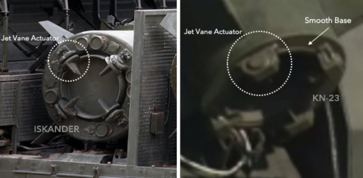Left: The base of Russiaโs Iskander-M missile showing the jet vanes and the associated actuators; Right: the base of the KN-23 shows significant differences.