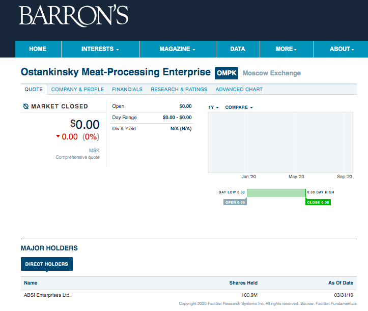 As of March 2019 ABSI Enterprises Ltd. is listed as the major holder of Ostankinsky Meat-Processing Enterprise (OMPK on the Moscow Stock Exchange) barrons.com/quote/stock/ru…