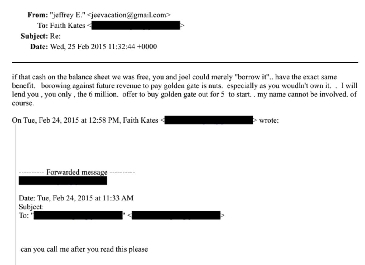Feb 2015 email in which Epstein said he will lend Kates 6 million to buy Golden Gate out, and to offer 5 to start "my name cannot be involved. of course."