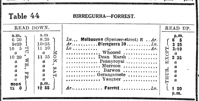Branched off at Birregurra, and ran through the foothills of the Otway Ranges to the town of Forrest.