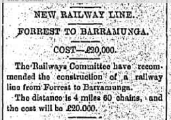 Proposals to extend the line from Forrest to Barramunga south of Forrest. Didn't eventuate despite the recommendation.