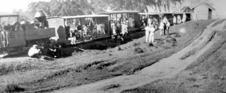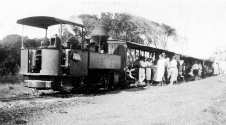 'Eudlo' locomotive with passenger carriages at the Coolum tramline terminus, ca 1926 sunshinecoast.spydus.com/cgi-bin/spydus…