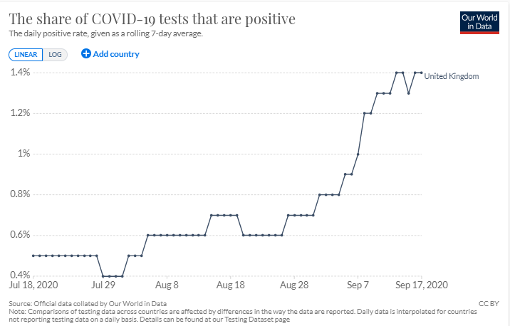We can see this in the % positive of COVID-19 tests run in the UK. While it's relatively low now, it is still above 1% (i.e. >1/100 tests run come back positive)