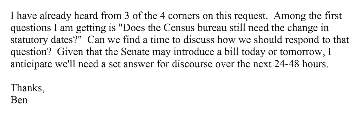9. By July 20, the Census Bureau's public position had become so uncertain that Chief Financial Officer Ben Page was not sure how to answer questions from leaders in Congress about whether the agency still needed #2020Census reporting deadlines changed: documentcloud.org/documents/7213…