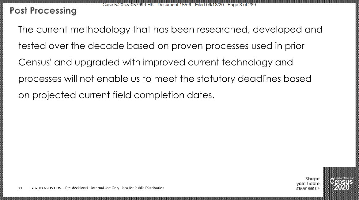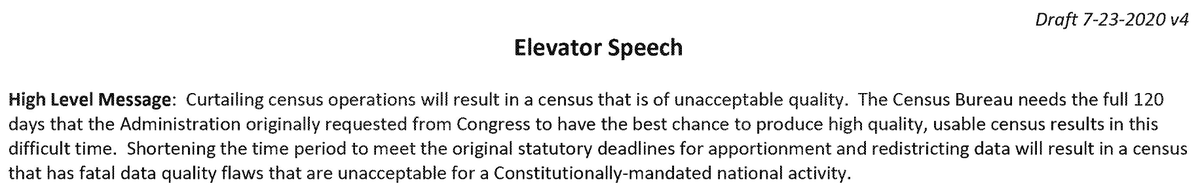 6. This 7/21 version of an "Elevator Speech" first drafted by Kathleen Styles, the Census Bureau's chief of 2020 census communications and stakeholder relations, warns: "Curtailing census operations will result in a census that is of unacceptable quality" assets.documentcloud.org/documents/7213…