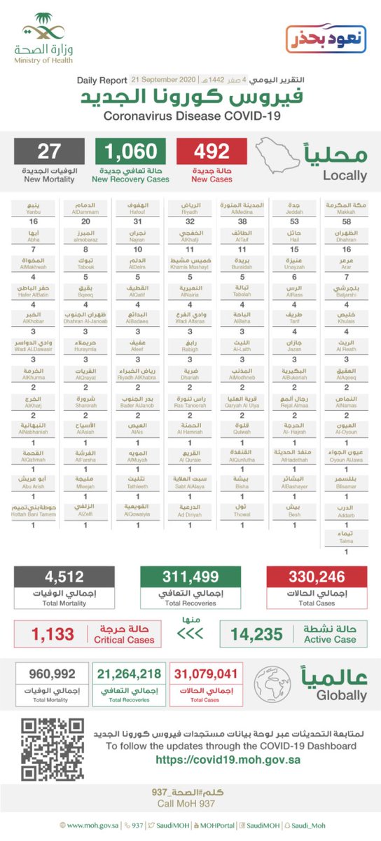 #BREAKING: Saudi Arabia reports 27 deaths and 492 new cases of #Covid_19, while 1,060 patients recovered from #coronavirus in past 24 hours