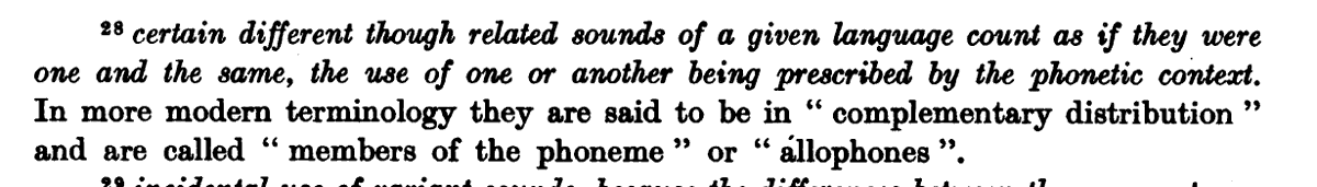 Hey linguists: does anyone know of a use before 1937 of "complementary distribution" (the term, not the concept) referring to allophones and phonemes? The earliest use I've found is in "The Origin of Aztec TL" by Whorf (1937). Wondering if he was first to use it that way.