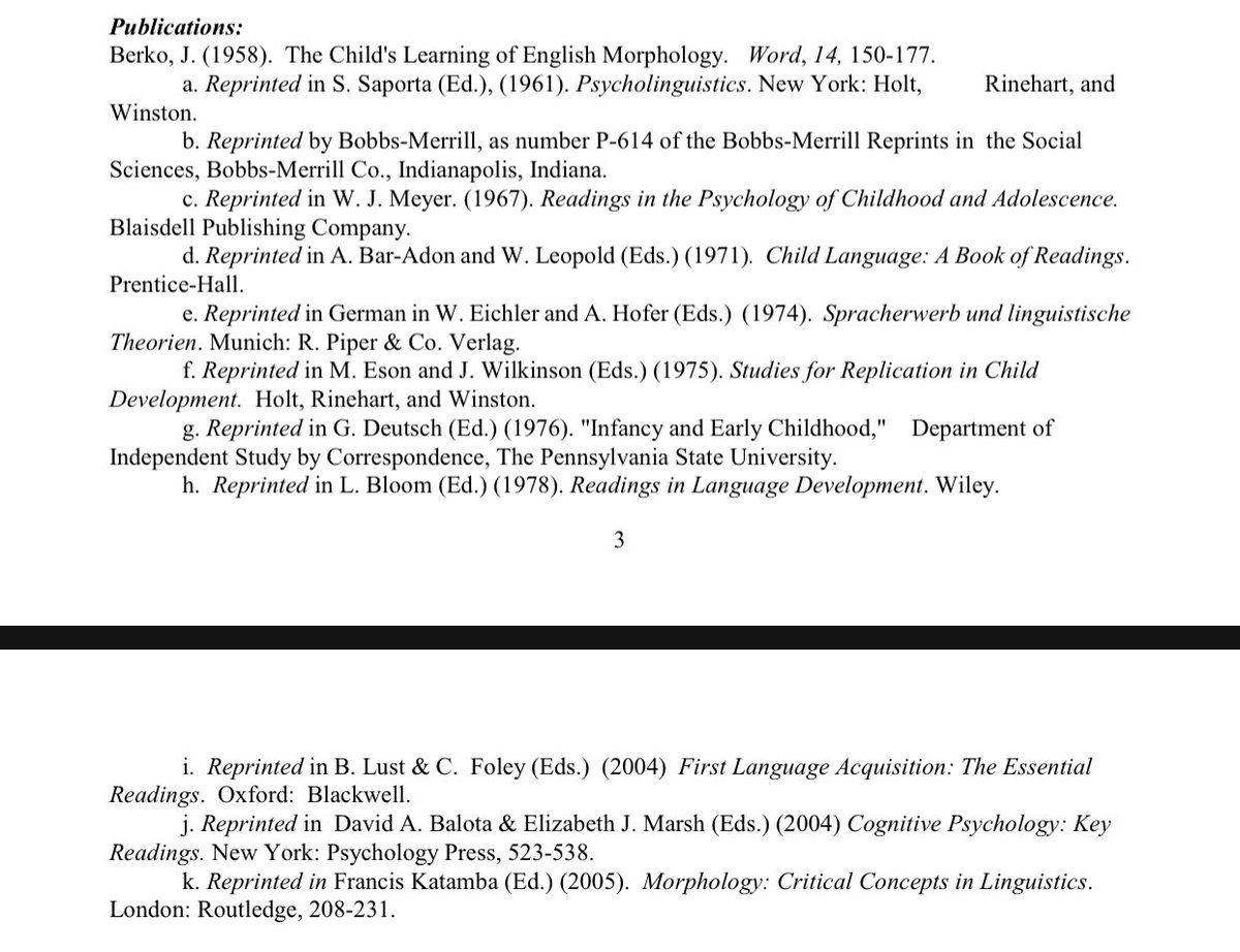 In all, the wug test paper has been reprinted 11 times. Every single one of them before the 2006 date that her lawyer claims as first publication. But don’t take my word for it: JBG claims the original 1958 paper and all 11 reprints on her public CV. 11/