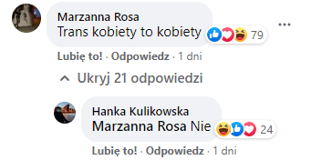 Proszę bardzo, pierwszy lepszy screen z dyskusji o terfach pod postem Krytyki Politycznej z tego tygodnia, jest obowiązkowy lajk od Kingi Petryki. Ona lajkuje absolutnie każde transfobiczne gówno, zresztą trudno żeby było inaczej, skoro śledzy i może współtworzy dużo tego syfu.
