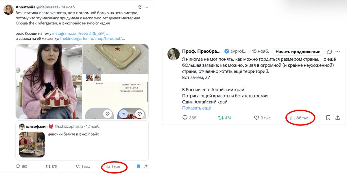 Опять же: у твита слева реакций меньше, а показов почти вдесятеро больше, чем у твита справа.