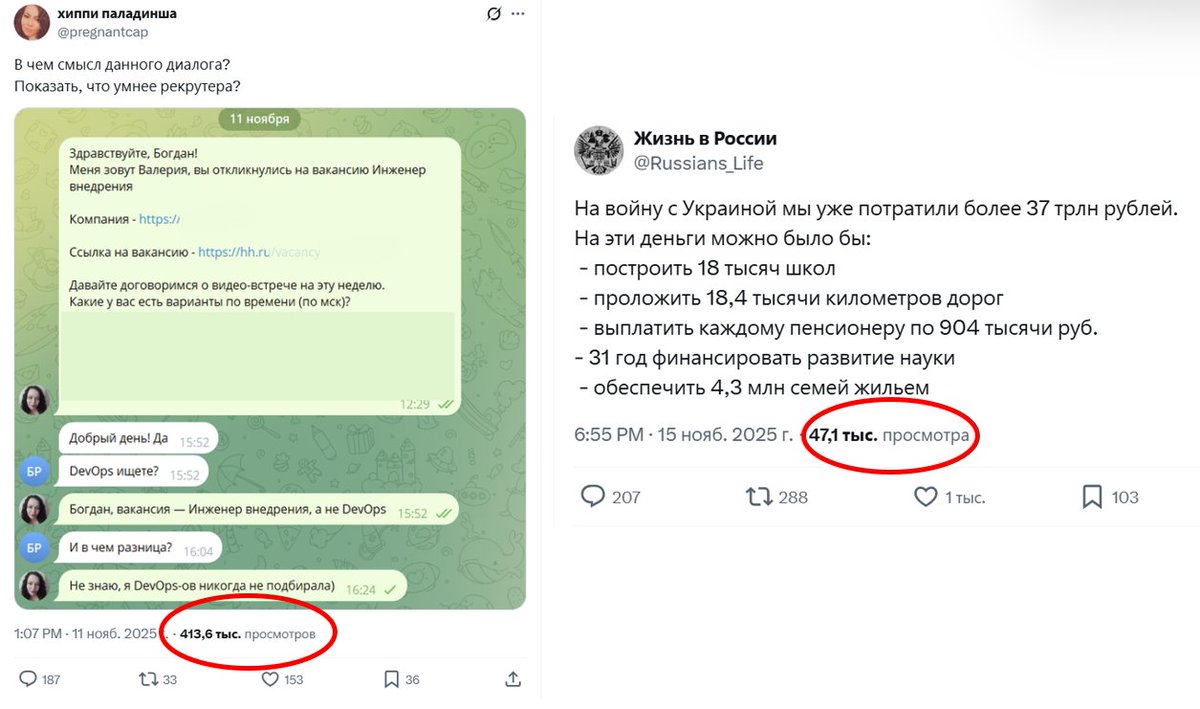 А показов у твита слева в 12 раз (!) больше.
