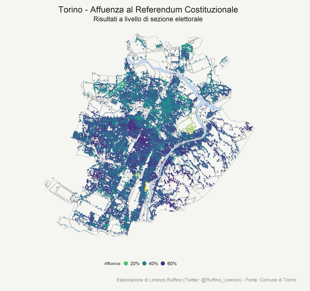 L'affluenza ha invece una distribuzione molto più omogenea, anche se nelle zone centrali hanno votato leggermente di più.