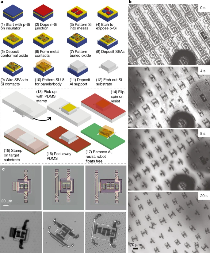 Cientistas criam primeiros robôs microscópicos com componentes semicondutores, que podem caminhar e ser controlados com sinais eletrônicos padrão.
