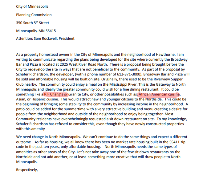Luepke-Pier feels very strongly about requiring a restaurant. Asks, when's the last time you had a meal in North Minneapolis? She will be voting against.