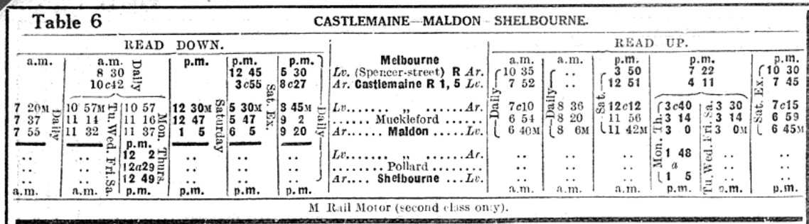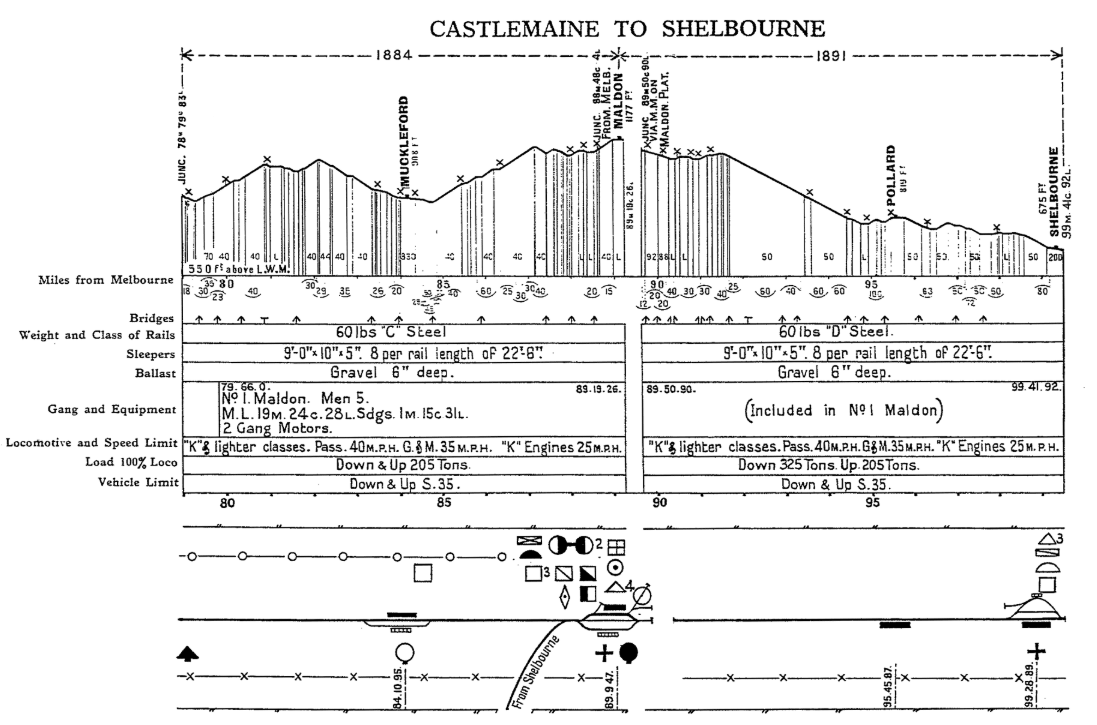 Maldon to Shelbourne opened 1891. The line was planned to extend 8 miles (13 km) beyond Shelbourne to Laanecoorie. Work on that section was suspended in 1890, even though initial works had been done.