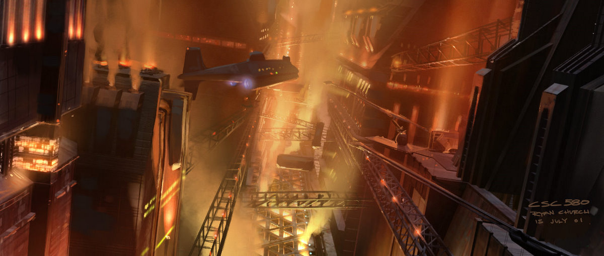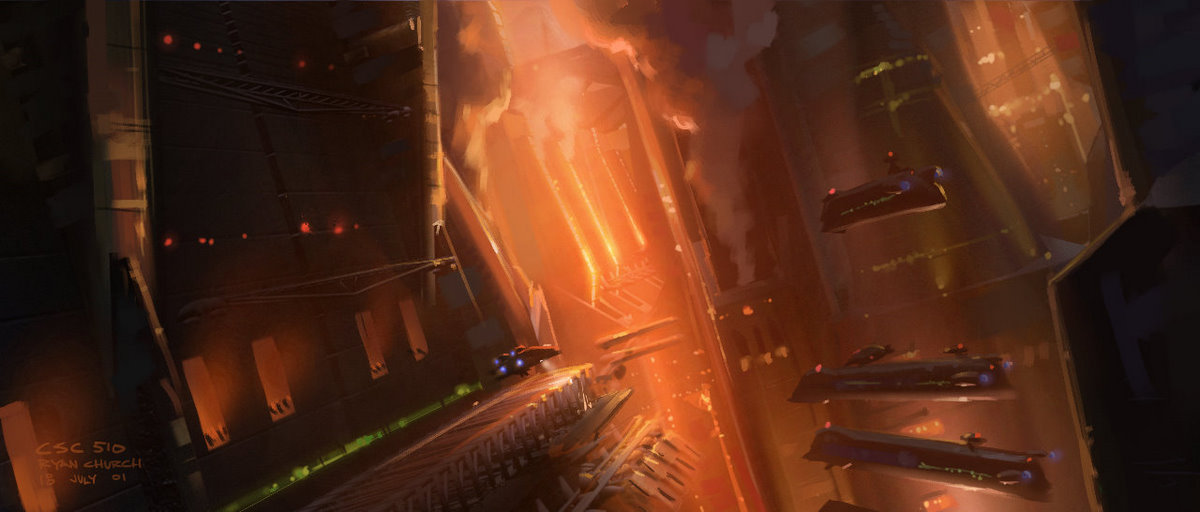 Church:"We provide key-frame production illustrations that are the link between the concept work that Doug [Chiang] and his group did, and the final work that the ILM matte painters and the effects crew will be doing. It's kind of previsualizing lighting, mood and color schemes".