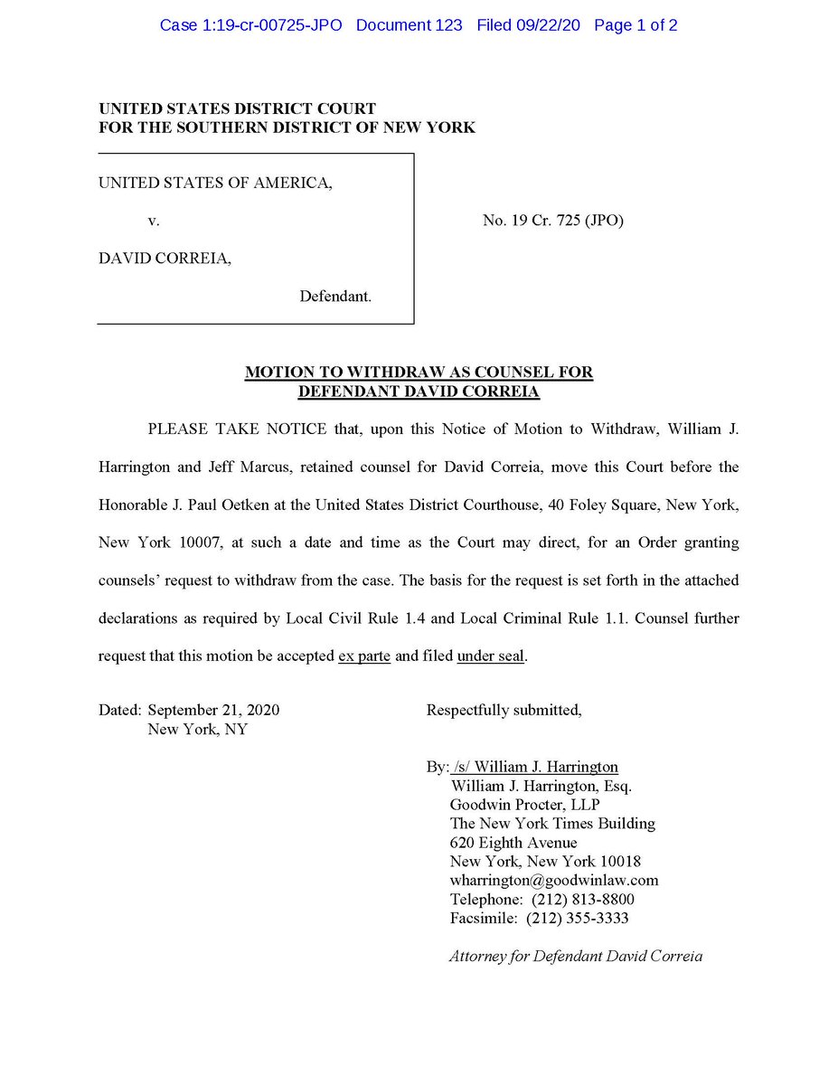 5. Here is the notice of sealed ex parte motion to withdraw by both of Corriera's attorneys.