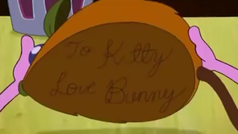 Coraje llevó consigo un ratón de juguete que le había regalado Bunny a Kitty con el siguiente escrito: "para Kitty, con amor Bunny".