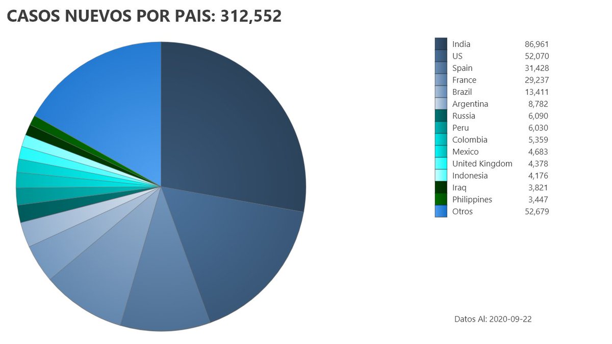 El país con mas casos nuevos es India con 86 mil seguido de USA, España y Francia. México está en décimo lugar de la métrica.