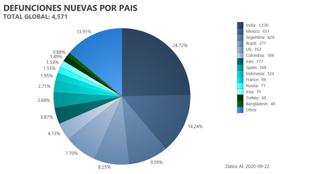 En defunciones nuevas México está en segundo lugar de la métrica y contribuye con el 5.52% del total de muertos mundial para el día de hoy.