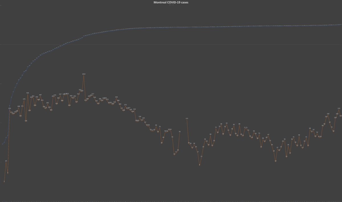 8) Meanwhile, the metropolis posted 142 new #COVID19 cases Tuesday. Please view the jagged but rising orange line in the chart below. Montreal’s seven-day rolling average is 61.11 cases per million population, which is taking place amid at least 53 active outbreaks.