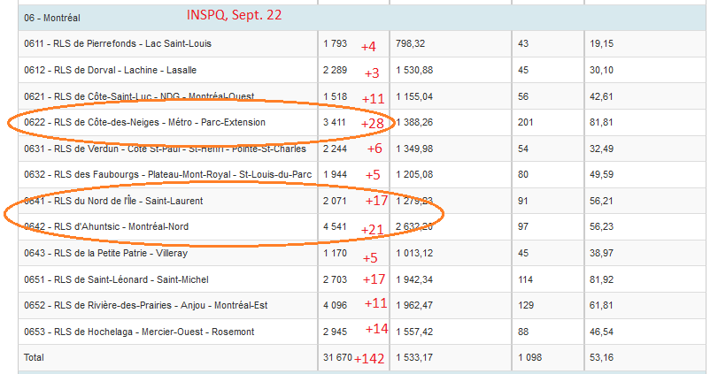 9) At the neighborhood level, the densely populated very centre of Montreal — Côte-des-Neiges, downtown and Parc-Extension — have grabbed the lion’s share of new #COVID19 cases for at least the past three days. (See the chart below.) If this keeps up, who knows what to expect?