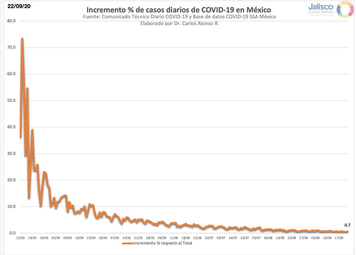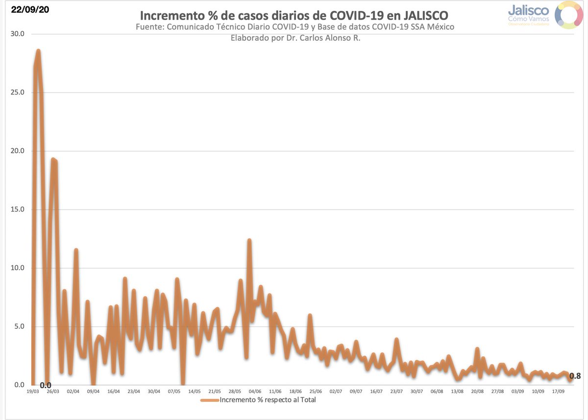 El crecimiento % diario en Jalisco en relación al total de casos del día anterior es de 0.8 con un promedio de crecimiento de 0.8 % en los últimos 7 días.