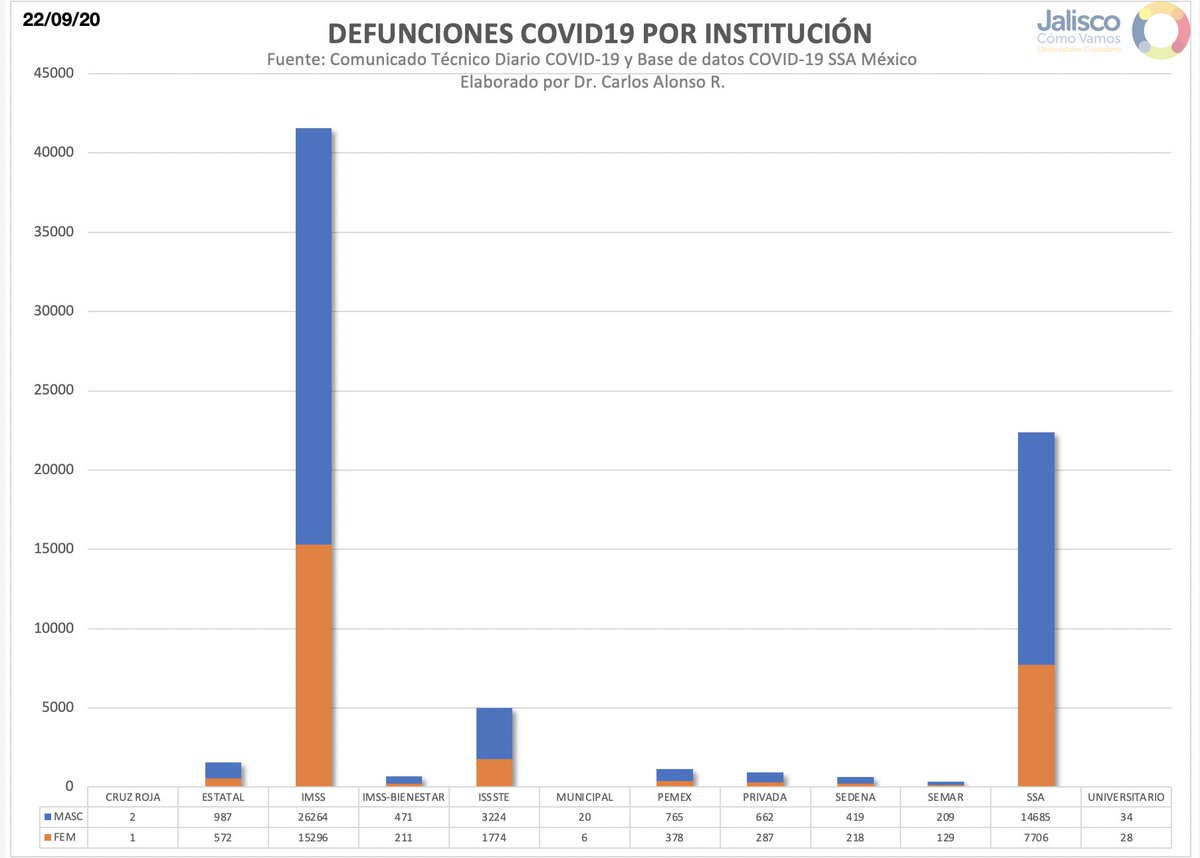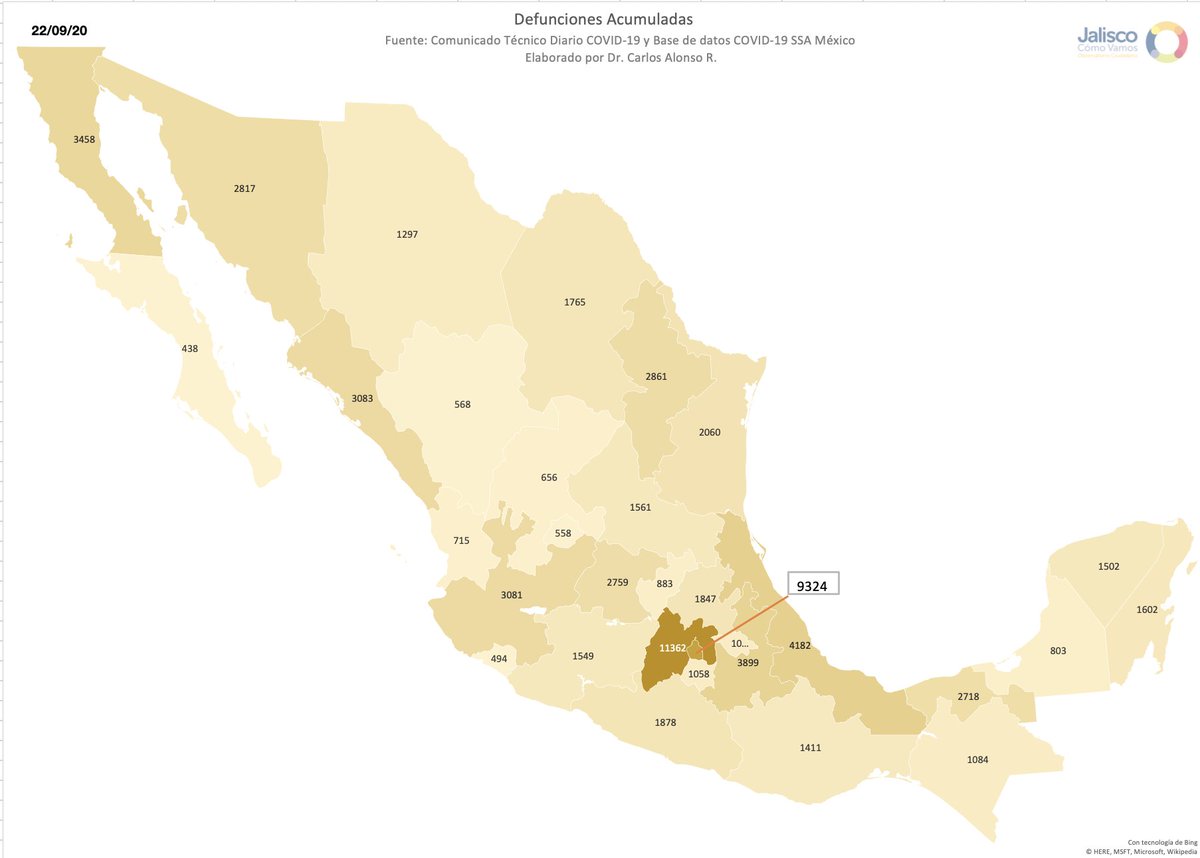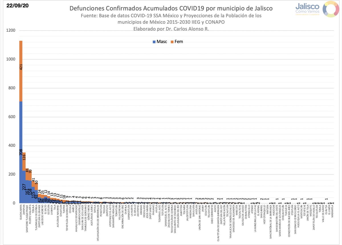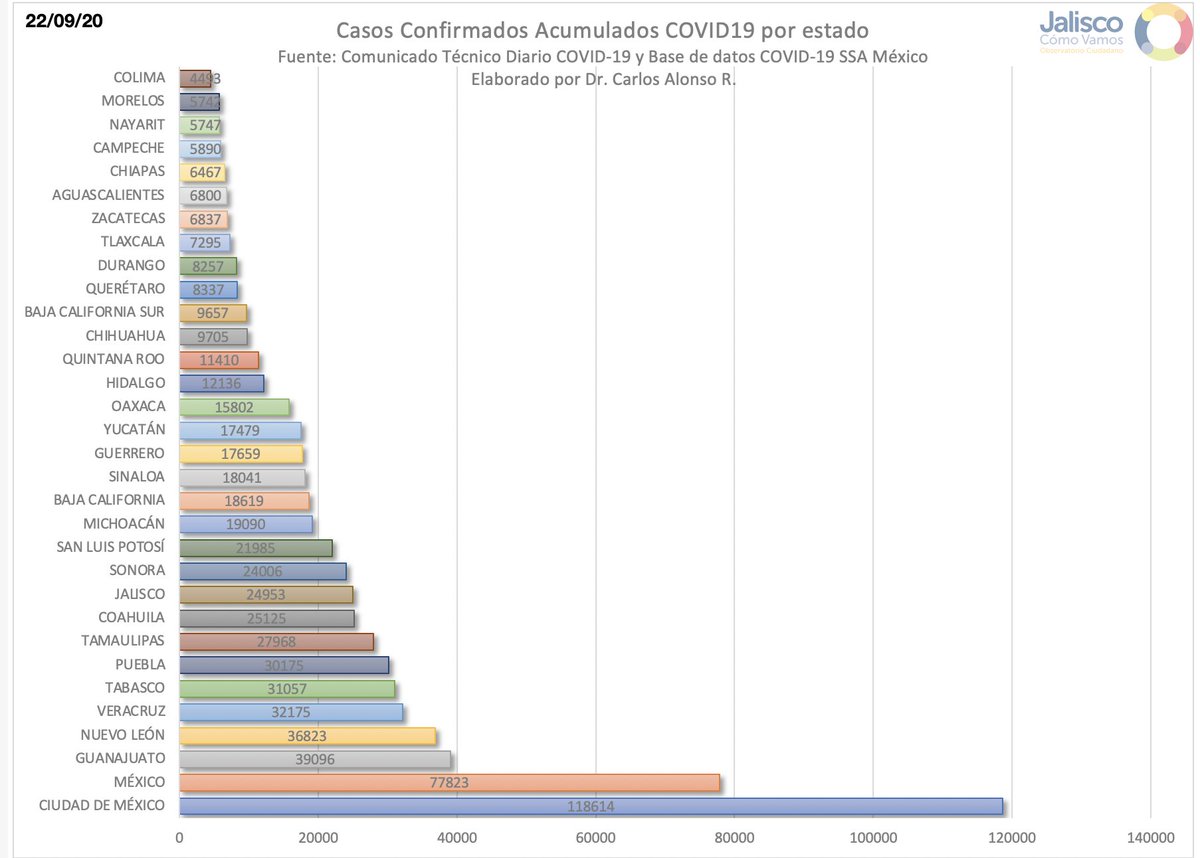 Jalisco: 44,560 confirmados, 5,100 defunciones y 2,292 casos activos. 336 casos y 27 Defunciones más que ayer.