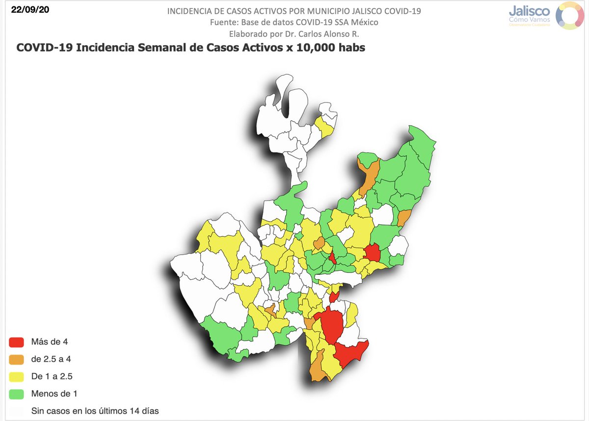 Aquí los casos acumulados e incidencia de casos activos por municipio en el estado de Jalisco.