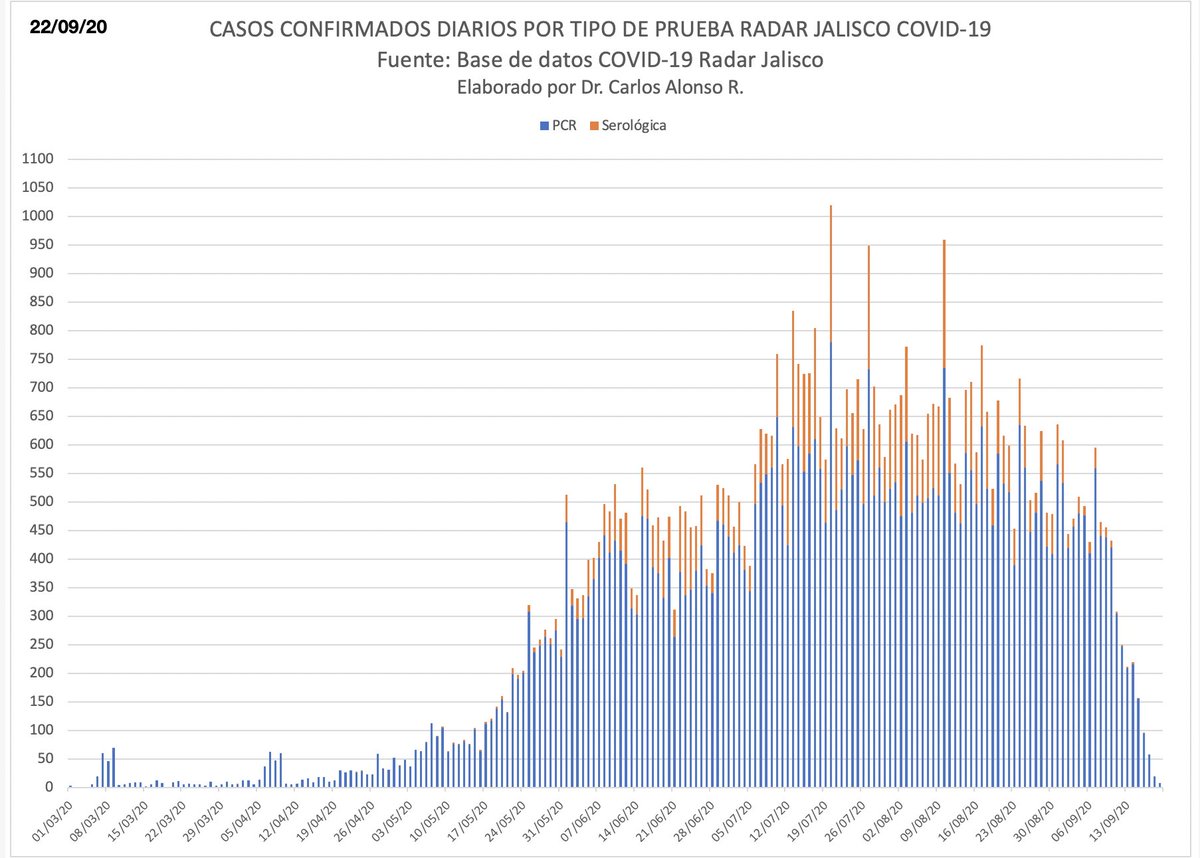 Por último la actualización diaria de la base de datos de @saludjalisco con el indicador de incidencia por millón de habitantes por semana y casos confirmados diarios por tipo de prueba al día de hoy.