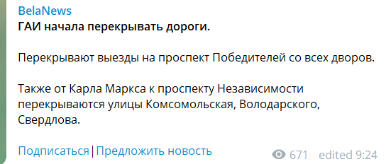 Prospekt Nezávislosti je uzavřen.. Okolní ulice uzavřeny v délce 500-800 metrů. Motolko píše, že je to až směšné jak se Lukašenko bojí Bělorusů.