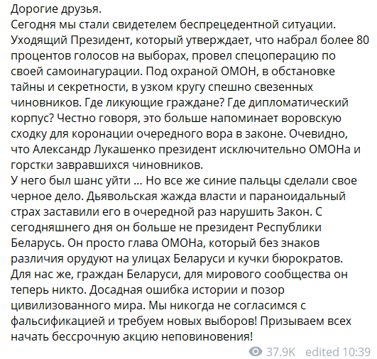 "Je téměř jisté, že dnes proběhne inaugurace Lukašenka, tajně zorganizovaná v neočekávaný den, bez upozornění předem. Vždyť právě tak probíhají inaugurace prezidentů, zvolených drtivou většinou 80% hlasů".