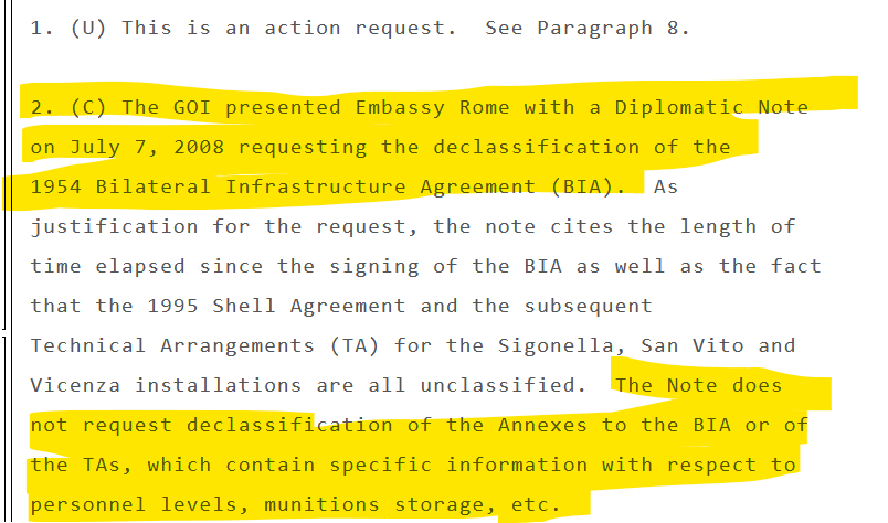 Nel luglio 2008 il governo #Berlusconi comunicò agli USA la sua richiesta di desecretare testo dell'accordo, NON allegati e Technical Agreement