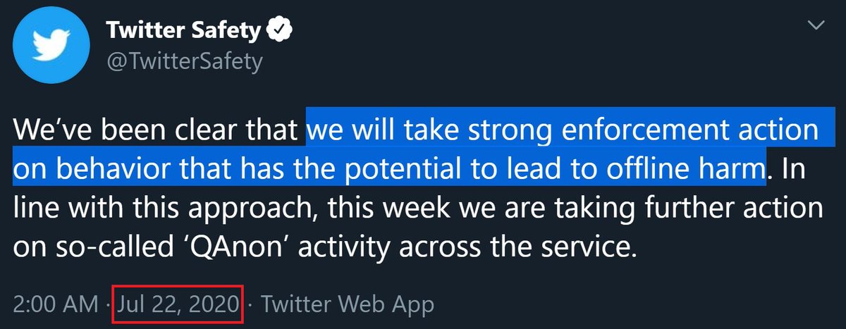 On July 22 you said "we will take strong enforcement action on behavior that has the potential to lead to offline harm."