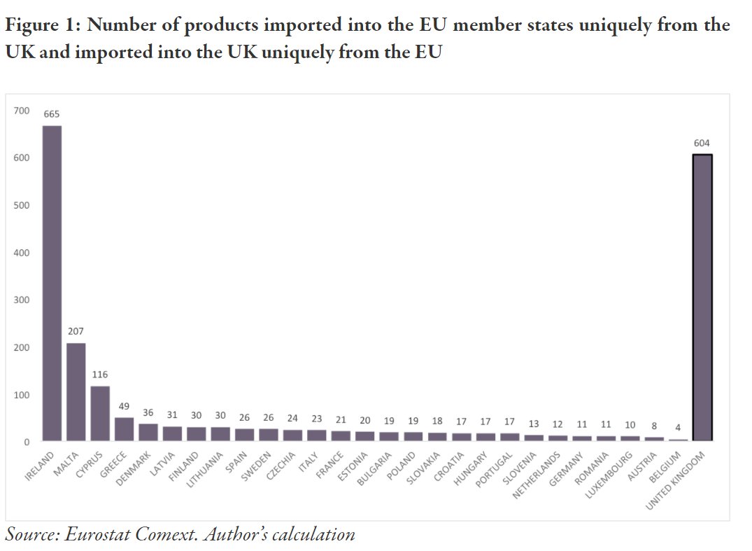 Breaking down the data to country level we see that Ireland, Malta, and Cyprus are the three EU Member States with the most products bought from the UK and nowhere else. Which I think should worry us about how much the UK has relied on historical ties for trade.